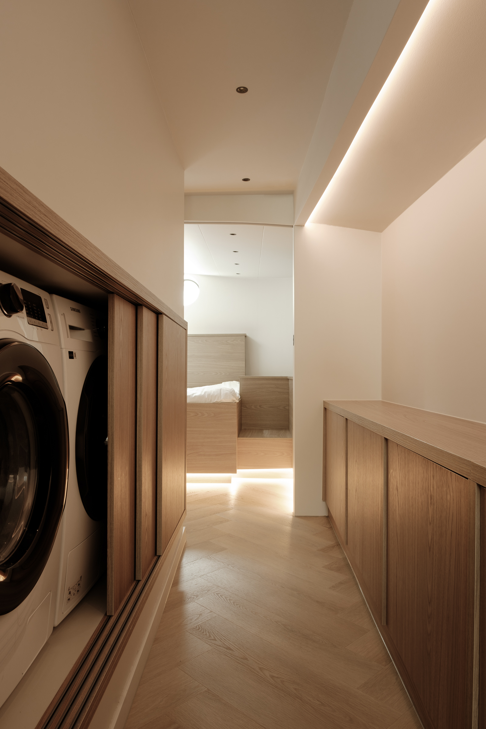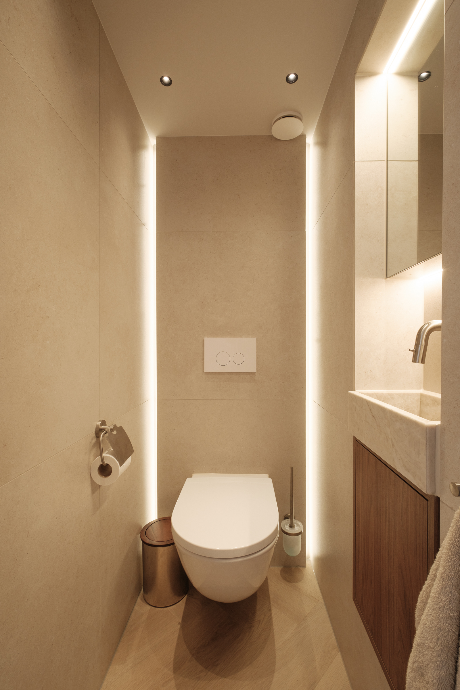Net als in de andere ruimtes worden de plinten van de kasten geaccentueerd met een subtiele lichtlijn van ledstrips.