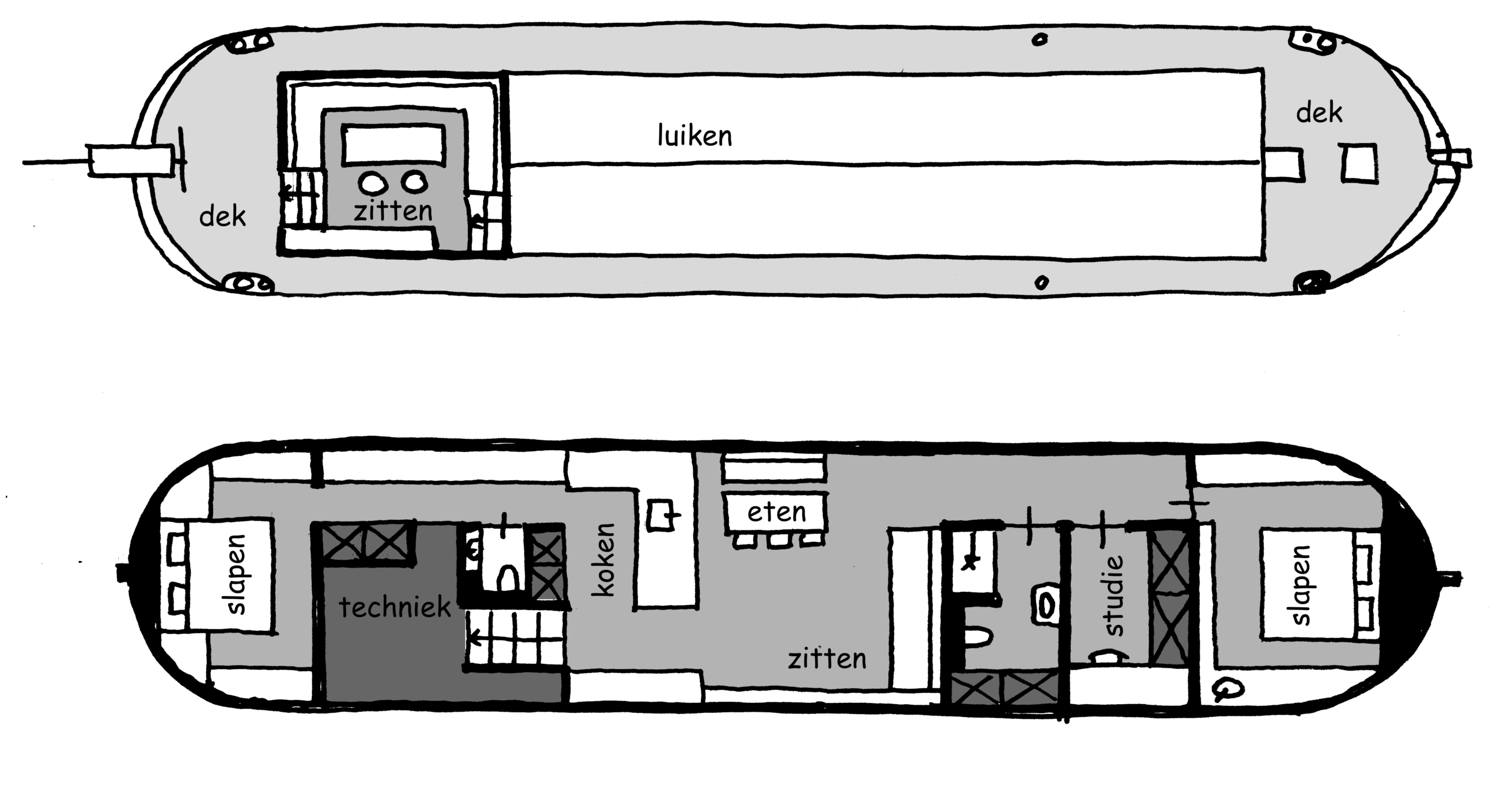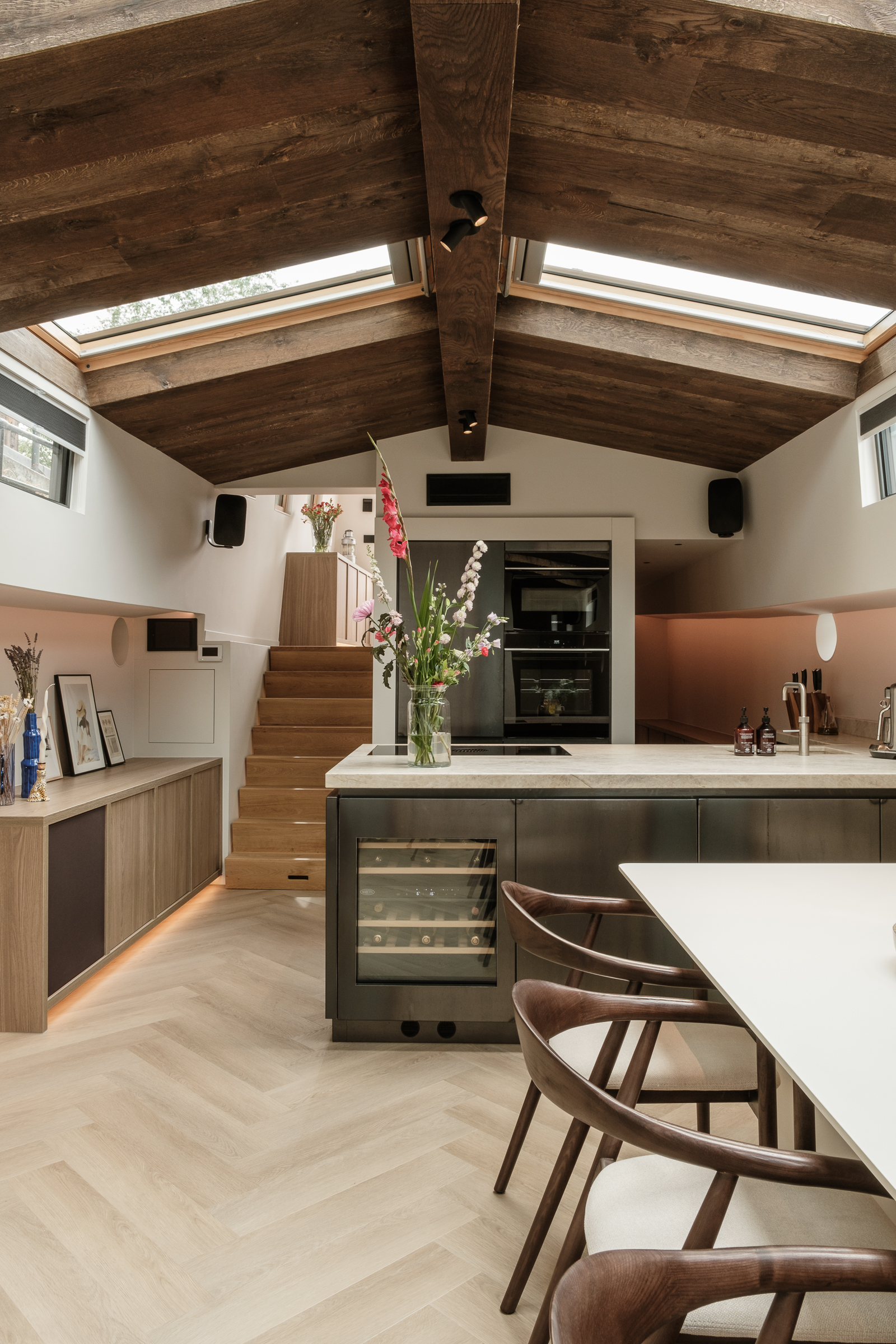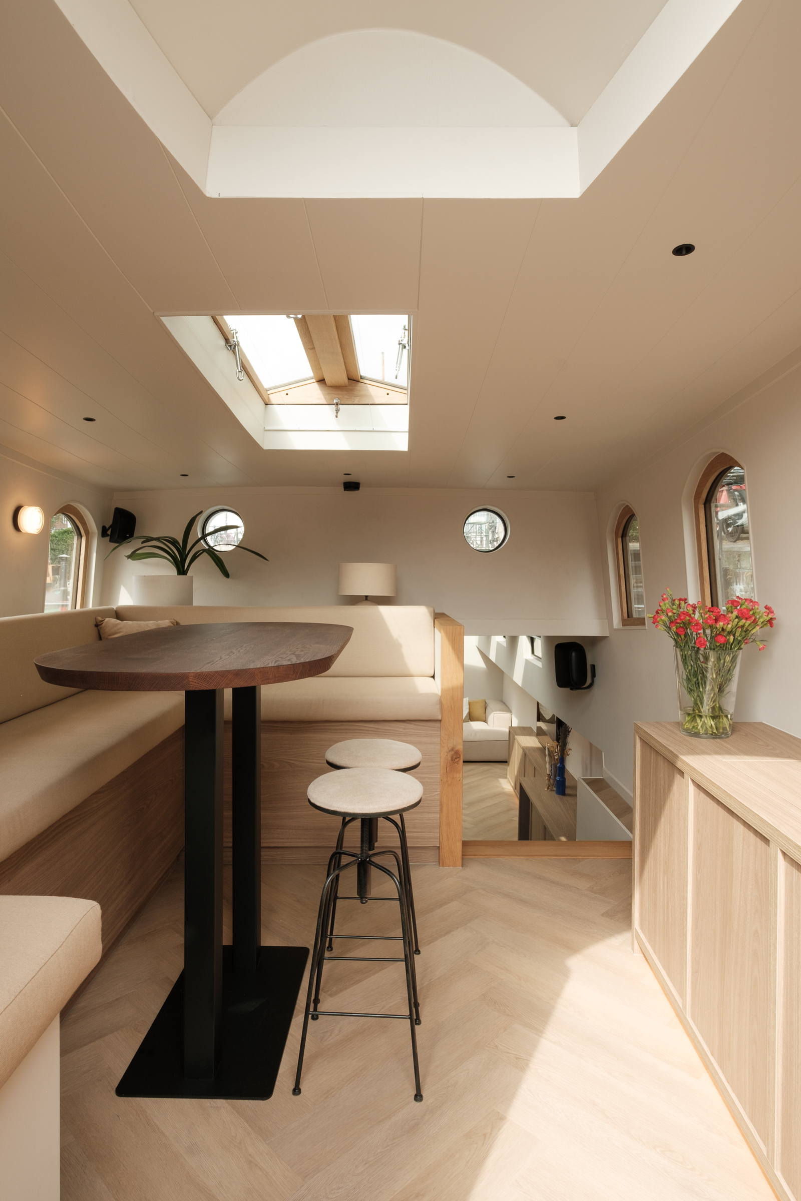 De woonkamer en keuken als één grote ruimte, met aan één zijde een doorgang naar zowel het voor- als het achteronder. Het timmerwerk volgt alle lijnen van het schip. Er is veel gebruikgemaakt van indirecte verlichting, wat zorgt voor een ruimtelijk gevoel en een luxe uitstraling. Barnwood als plafondmateriaal: een knipoog naar de traditionele luikenkap.