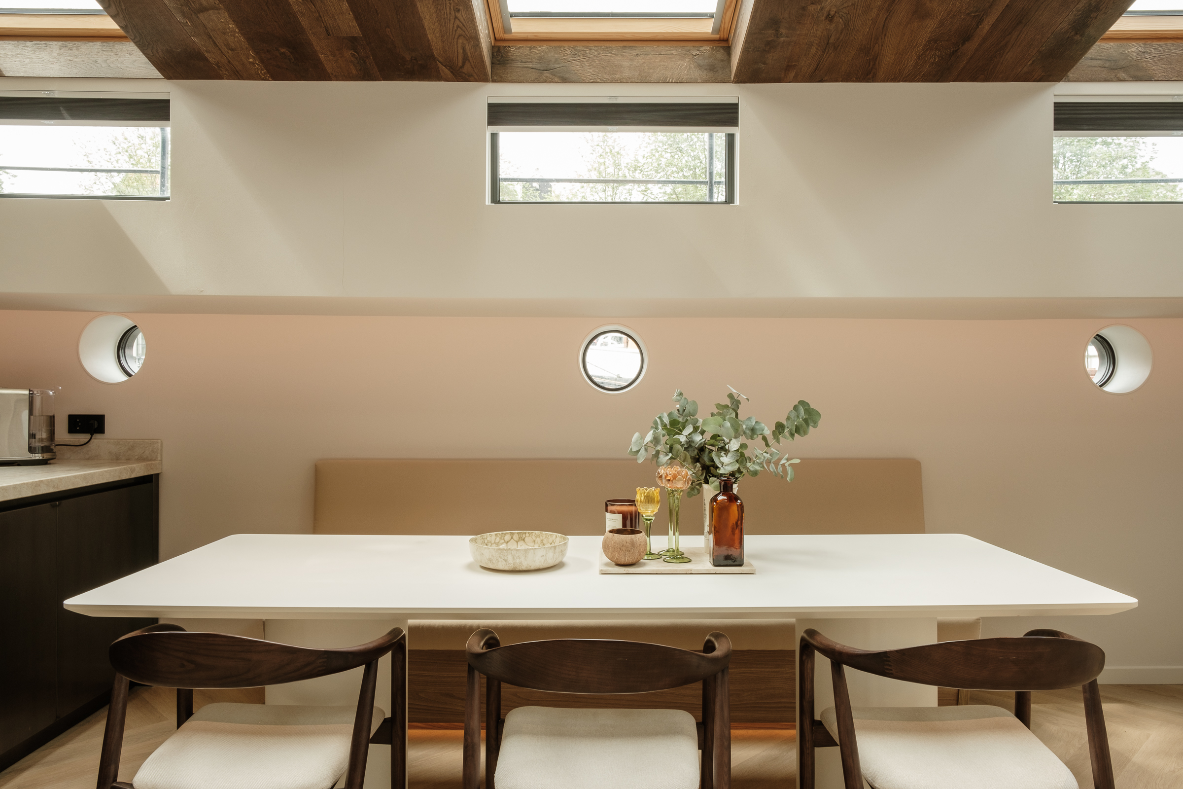 Traditionele houten dakramen (ook hier triple glas) met elektrische bediening, verduistering en zonwering. De dakramen zijn uitgelijnd met de ramen in de den en de patrijspoorten. Dit zorgt voor ritme, rust, veel daglicht en een mooi uitzicht naar buiten.