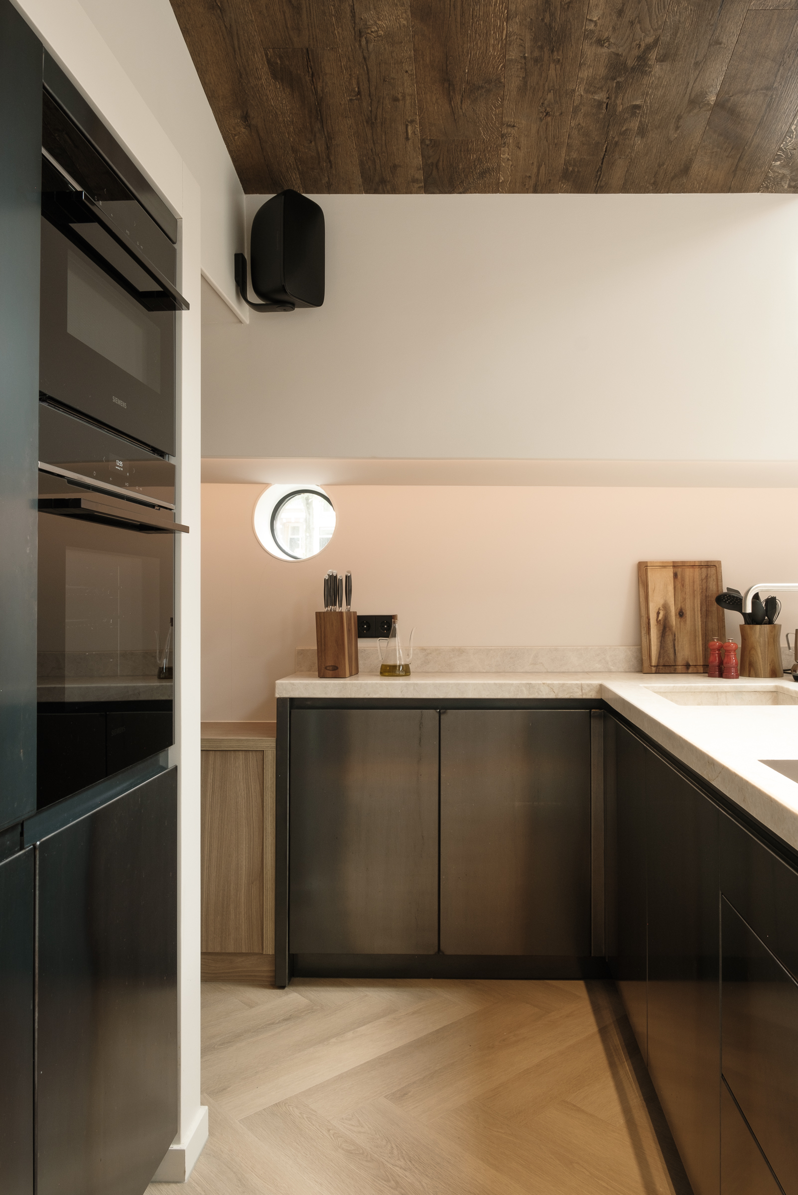 De keuken van blauwstaal met een vlam brengt het staal van het schip terug in het interieur. De vlam ontstaat door er met een grote wals onder grote hitte overheen te gaan.