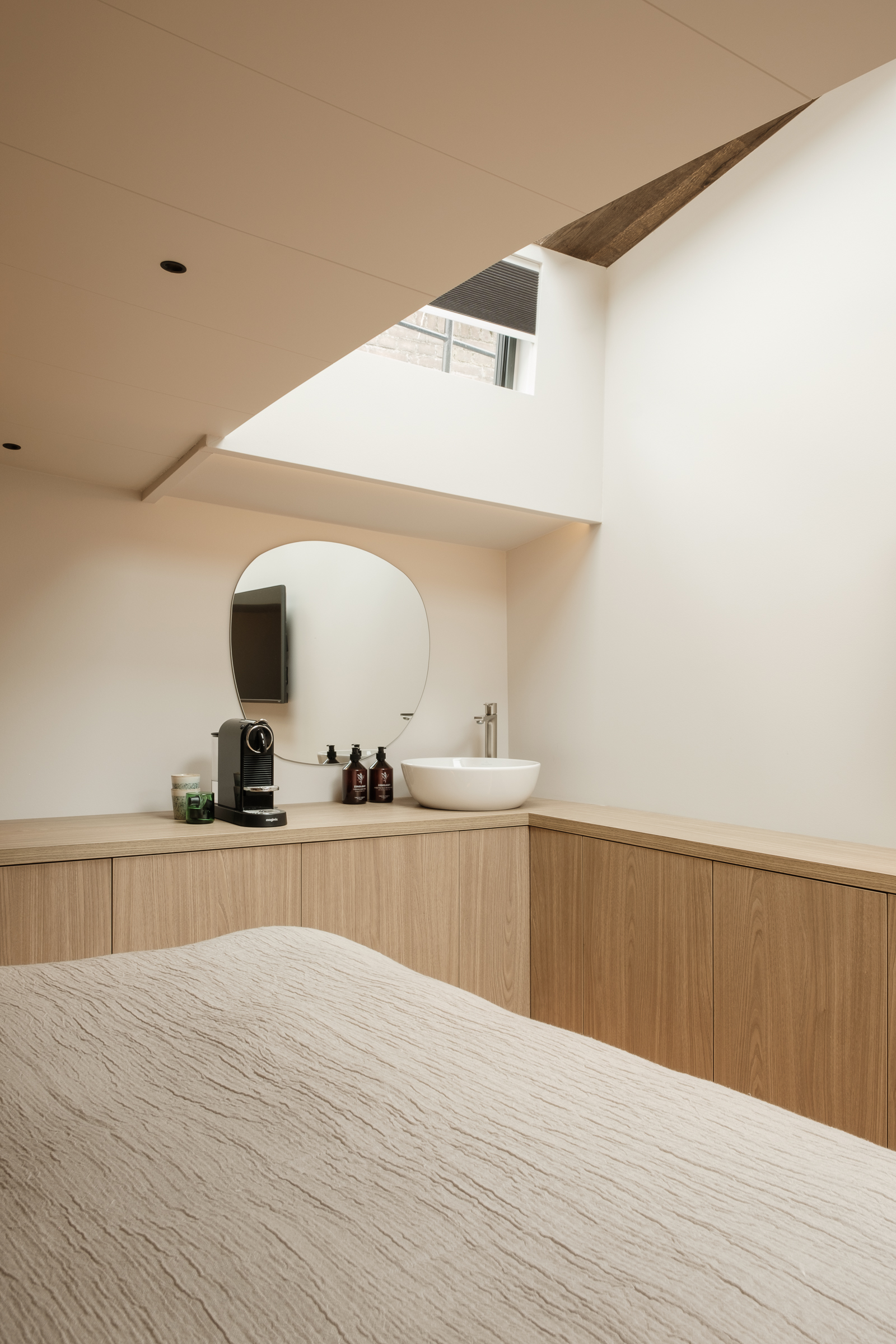 De slaapkamer in het vooronder heeft een wastafeltje met koffiemachine. Het dakluik biedt een mooi uitzicht en dient ook als vluchtluik bij brand.