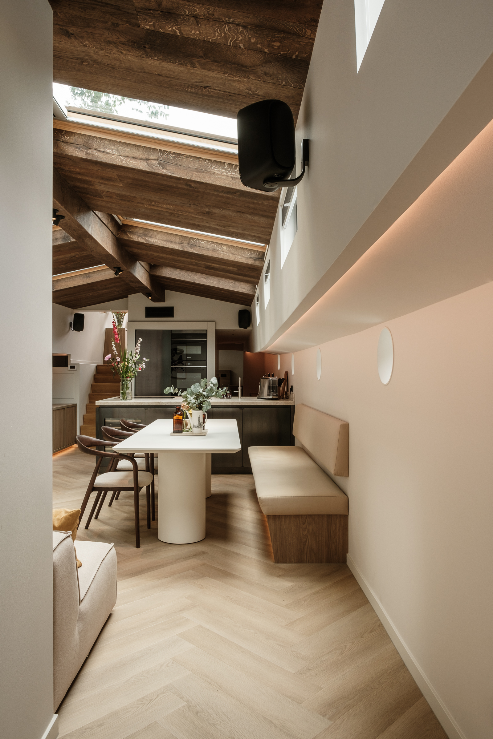 De roef als extra woonkamer, met een U-bank, bartafel, dressoir met tv-lift en een grote koekoek voor het daklicht. Omdat de U-bank hol is, kon er daaronder, in de doorgang van het ruim naar het achteronder, een toilet met stahoogte worden gecreëerd.